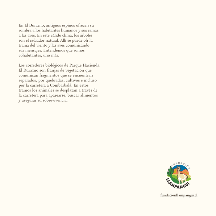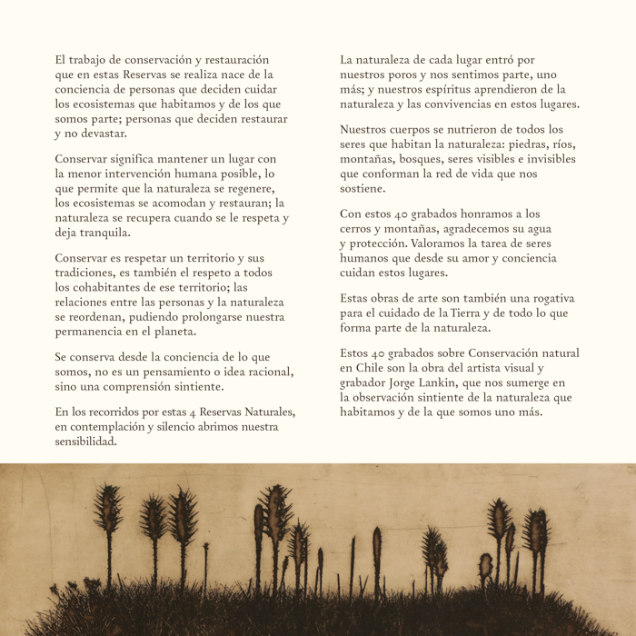 La Fundación Llampangui fue institución colaboradora de este hermoso proyecto, acogiendo al artista durante su proceso creativo en el parque. Desde el corazón del semiárido chileno, Jorge Lankin capturó con sensibilidad la riqueza natural y cultural de este territorio único, a través de grabados que invitan a observar, sentir y conservar.