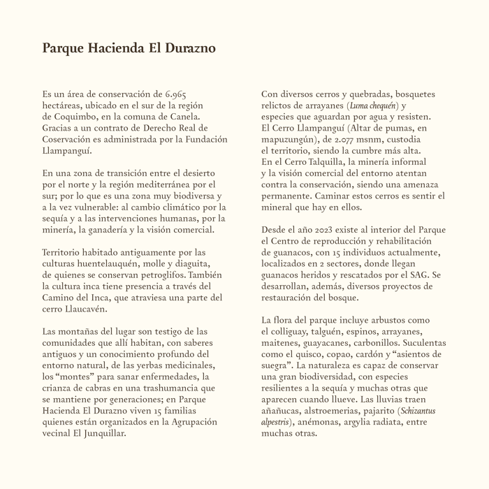 Agradecemos profundamente a Jorge Lankin por elegir El Durazno como una de las reservas protagonistas de su trabajo, y por aportar con arte a la visibilización del valor ecosistémico y cultural de esta zona de transición entre desierto y bosque esclerófilo.